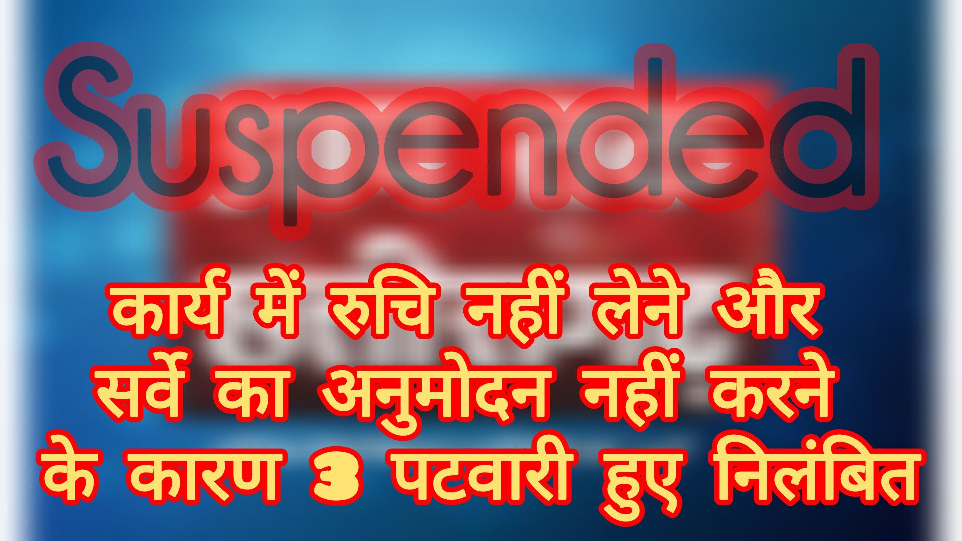 सर्वेयरों को सर्वे हेतु खसरा आवंटित करने में विलंब करने और किसी भी सर्वेक्षित खसरे का अनुमोदन नहीं करने के कारण छत्तीसगढ़ सिविल सेवा आचरण नियम 1966 के तहत निलंबित किया है। इन तीनों पटवारियों को नियमानुसार जीवन निर्वाह भत्ता दिया जाएगा।