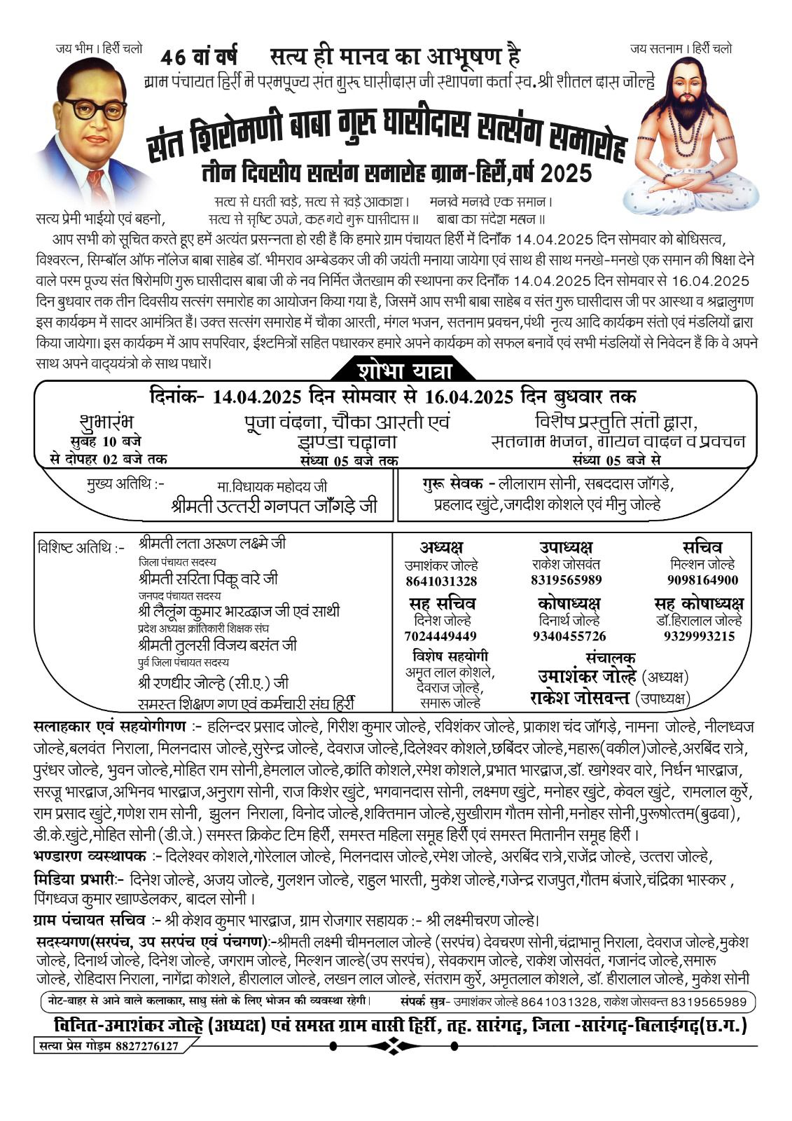 सत्संग समारोह में अध्यक्ष श्री उमाशंकर जोल्हे,उपाध्यक्ष श्री राकेश जोशवंत ,सचिव श्री मिलशन जोल्हे ,कोषाध्यक्ष श्री दिनार्थ जोल्हे ,वरिष्ठ पत्रकार श्री राहुल भारती, श्री दिनेश जोल्हे ,गुलशन जोल्हे (गोल्डी ),मुकेश जोल्हे ,पिङ्गध्वज खाण्डेलकर,अजय जोल्हे एवं समस्त ग्रामवासी द्वारा सभी क्षेत्र के लोगों को आंमत्रित किया गया है।