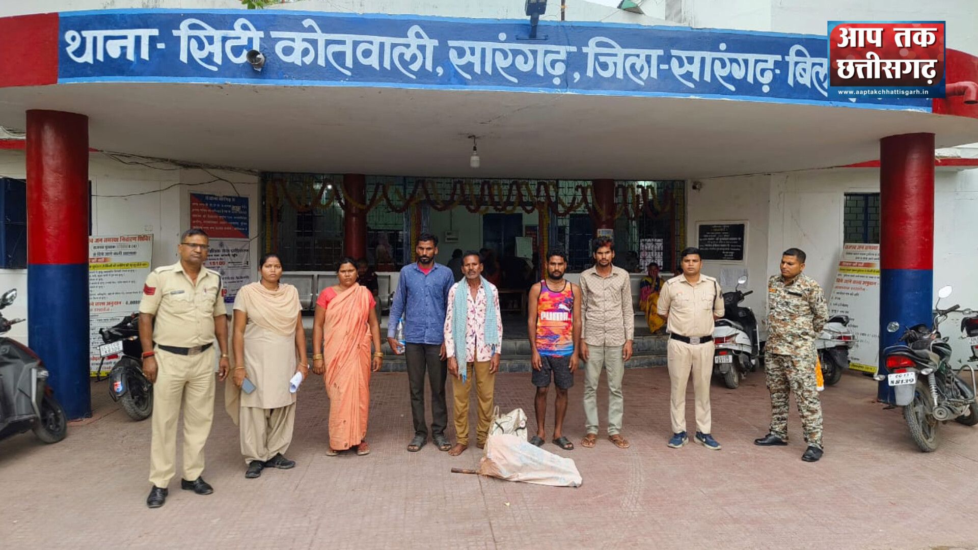 अप0क्रं0- 169/2025 धारा- 4,5,10 छ0ग0 कृषिक पशु परिरक्षण अधिनियम 2004 में जरिये मुखबीर से सूचना मिली कि ग्राम छिन्द डीपरापारा मे कुछ लोग गौ हत्या कर मांस बेचने के लिए रखे हुए है सूचना तस्दीक हेतु पुलिस टीम रवाना होकर ग्राम छिन्द डिपरापारा अंतराम के खेत पहुचकर पुलिस टीम के द्वारा घेराबंदी कर आरोपीगण- 01. राजू मिरी पिता सुखरू मिरी उम्र 26 वर्ष 02. अर्जुन मिरी पिता छिनाउ मिरी उम्र 35 वर्ष 03. सुखरू मिरी पिता स्वं. कांशीराम मिरी उम्र 58 वर्ष 04 सुकचैन मिरी पिता स्वं. दयाराम मिरी उम्र 27 वर्ष 05. राधिका मिरी पति निर्मल मिरी उम्र 30 वर्ष साकिनान छिन्द डीपरापारा थाना सांरगढ जो पुलिस को देख कर भाग रहे थे जिसे पुलिस द्वारा घेराबंदी कर पकड़ा गया,