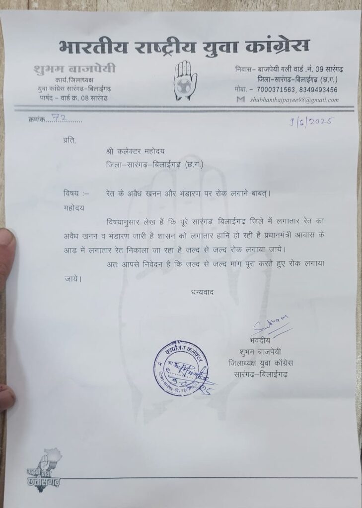 Sarangarh- आज युवा कॉंग्रेस जिलाध्यक्ष शुभम बाजपेयी द्वारा कलेक्टर ऑफिस पहुंच कर अवैध रेत खनन व भंडारण के ख़िलाफ़ ज्ञापन सौपा है अगर कार्यवाही नहीं की जाती हैं तो प्रदर्शन करेंगे ऐसी जानकारी जिलाध्यक्ष युवा कॉंग्रेस शुभम बाजपेयी ने दी है।