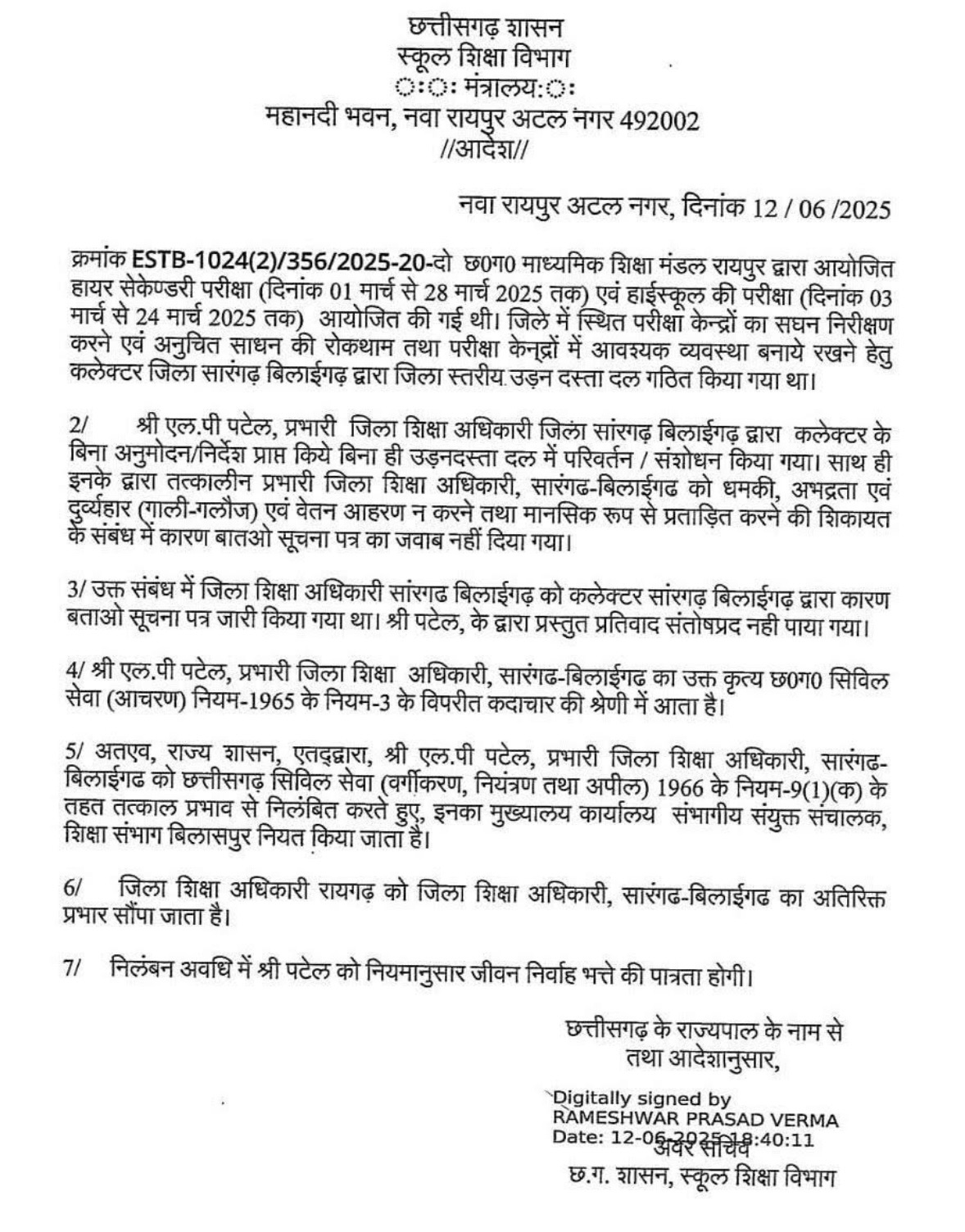 जांच प्रतिवेदन के आधार पर एल.पी. पटेल की कार्रवाई को सेवा नियमों का उल्लंघन माना गया और छत्तीसगढ़ सिविल सेवा नियम 1965 की धारा-3 के अंतर्गत दोषी करार दिया गया। इसके तहत राज्य शासन ने उन्हें तत्काल प्रभाव से उनके पद से हटाते हुए, मुख्यालय में संबद्ध करने का आदेश दिया है।