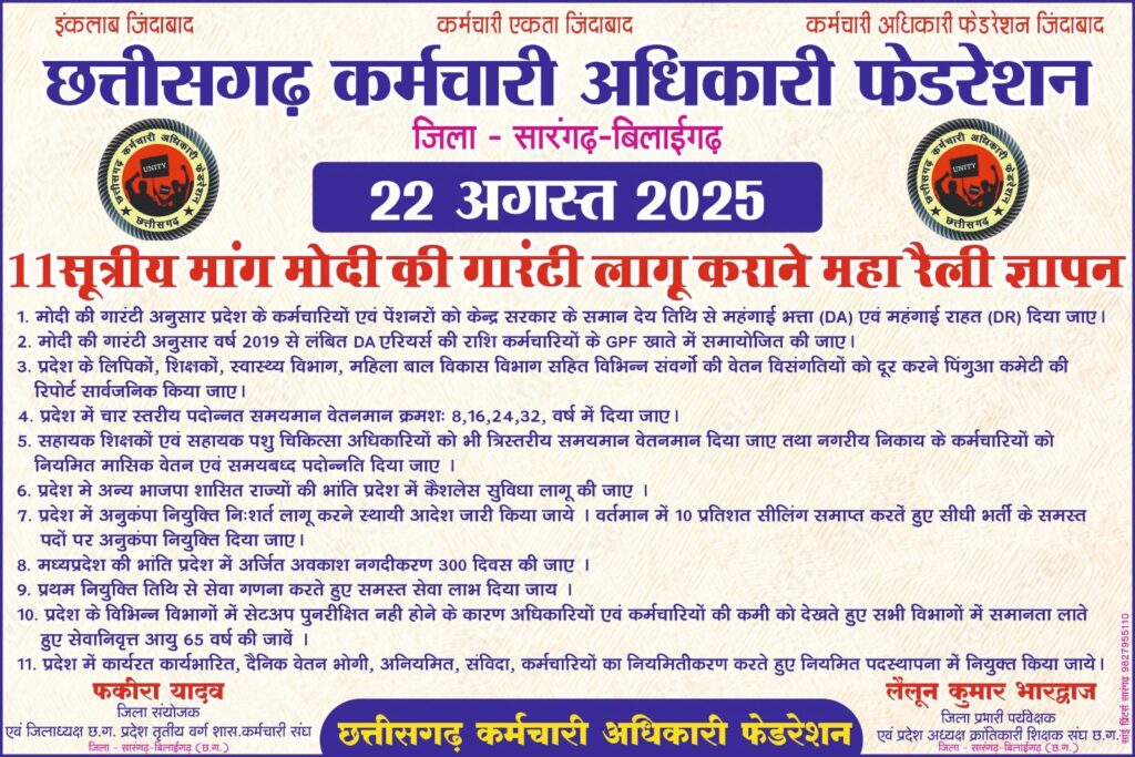 फेडरेशन ने कहा कि प्रदेश में “मोदी की गारंटी फेल” है और लंबे समय से कर्मचारियों की समस्याओं का समाधान नहीं हो रहा। महंगाई, वेतन विसंगति, महंगाई भत्ता, पदोन्नति, पेंशन, नई भर्ती सहित अन्य मुद्दों को लेकर उन्होंने साय सरकार पर निशाना साधा।