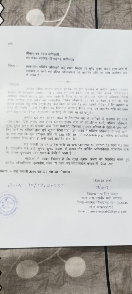 सारंगढ़-बिलाईगढ़। वन विभाग सारंगढ़-बिलाईगढ़ में बड़े स्तर पर वित्तीय गड़बड़ी और गबन का मामला सामने आया है। शिकायतकर्ता जितेन्द्र नाथ सिंह ठाकुर ने वन मंडल अधिकारी को लिखित आवेदन देकर आरोप लगाया है कि वन परिक्षेत्र अधिकारी सुरेंद्र अजय द्वारा मजदूरी भुगतान में भारी वित्तीय अनियमितता की गई है।