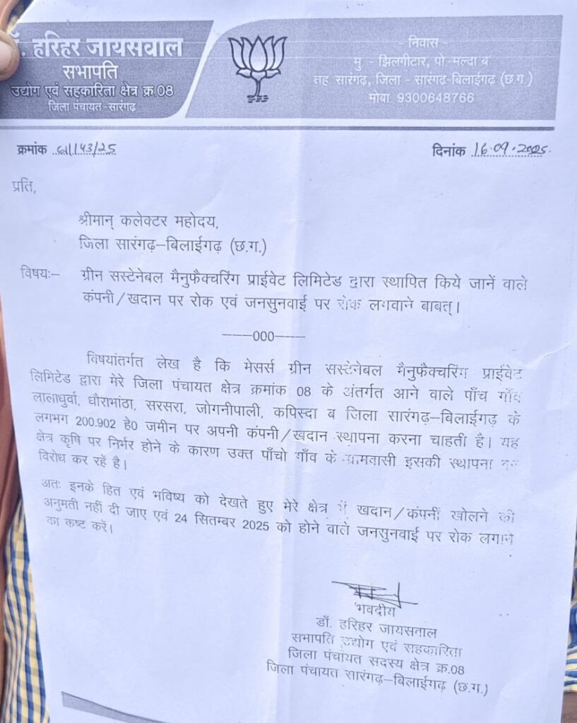 ग्राम पंचायत लालाधुर्वा, धौराभांठा, सरसरा, जोगनीपाली और कपिसदा ब के ग्रामीणों ने सैकड़ों की संख्या में कलेक्टर कार्यालय पहुँचकर जोरदार विरोध दर्ज कराया। ग्रामीणों का कहना है कि लगभग 200.902 हेक्टेयर कृषि योग्य भूमि पर कंपनी “ग्रीन सस्टेनेबल मैन्युफैक्चरिंग प्रा. लि.” खदान स्थापित करना चाहती है, जो पूरी तरह खेती और आजीविका को नुकसान पहुँचाएगा।