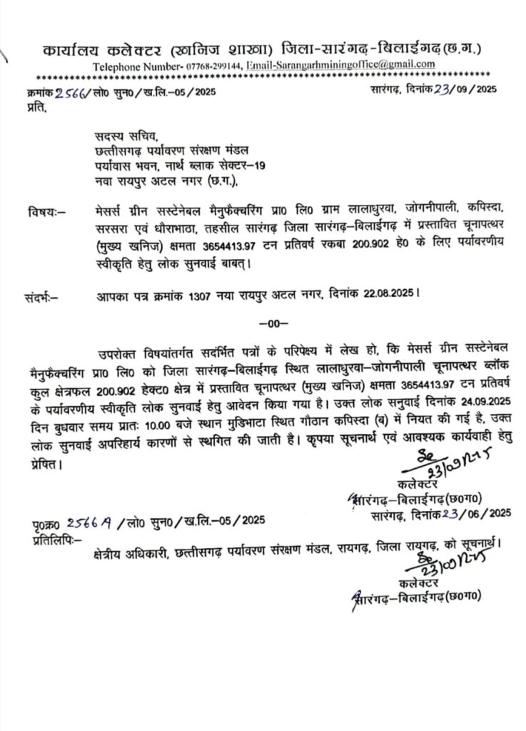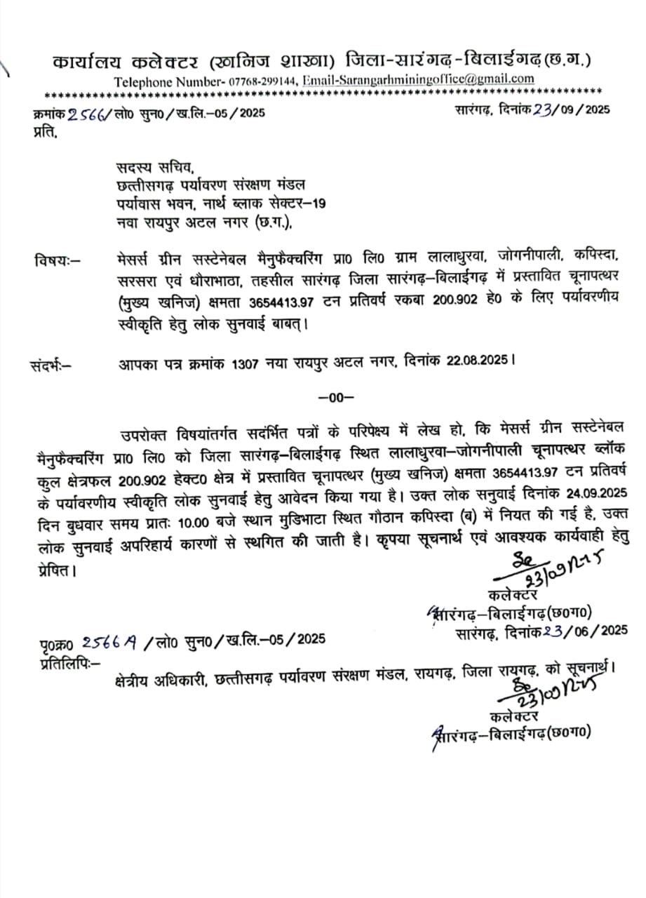 सारंगढ़। सारंगढ़-बिलाईगढ़ जिले में प्रस्तावित 500 एकड़ खेतिहर भूमि पर चुना पत्थर खदान की जनसुनवाई को लेकर उठे भारी जन आक्रोश के बाद आखिरकार प्रशासन को झुकना पड़ा। कलेक्टर ने आदेश जारी कर 24 सितंबर को होने वाली जनसुनवाई स्थगित कर दी है।