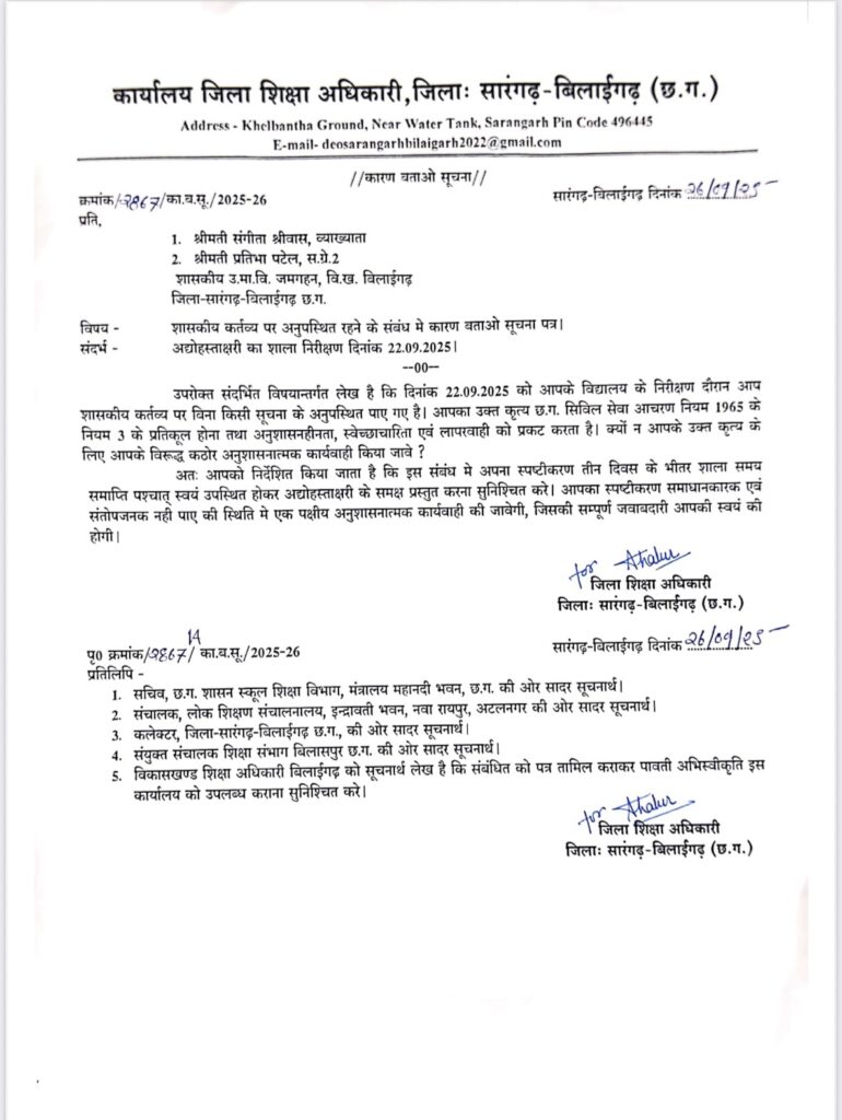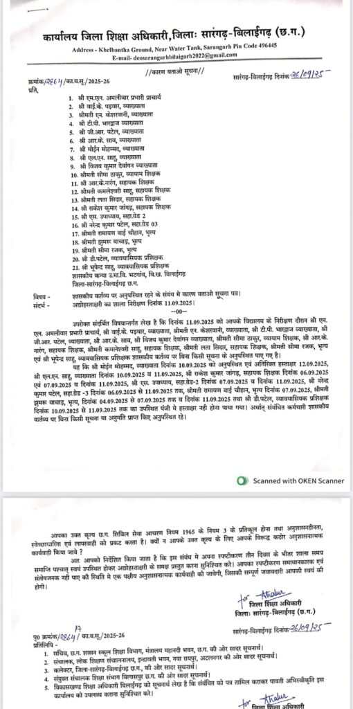 आमतौर पर दो-चार शिक्षकों पर कार्रवाई की खबर आती है, लेकिन इस बार मामला चौंकाने वाला है क्योंकि एक ही स्कूल (शासकीय कन्या उ.मा.वि. भटगांव) के 21 शिक्षकों पर नोटिस जारी किया गया है। वहीं, हायर सेकेंडरी स्कूल जमगहन के 2 शिक्षक भी बिना अनुमति अनुपस्थित पाए गए।