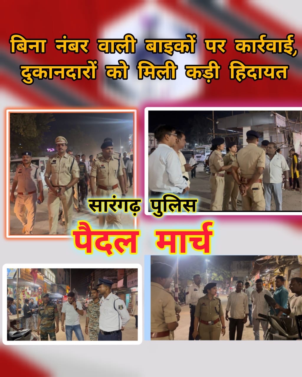 सारंगढ़। दीपावली पर्व को शांतिपूर्ण एवं व्यवस्थित ढंग से मनाने के उद्देश्य से सारंगढ़ पुलिस प्रशासन, नगरपालिका और राजस्व विभाग की संयुक्त टीम ने मंगलवार शाम नगर में व्यापक फ्लैग मार्च एवं पेट्रोलिंग अभियान चलाया।