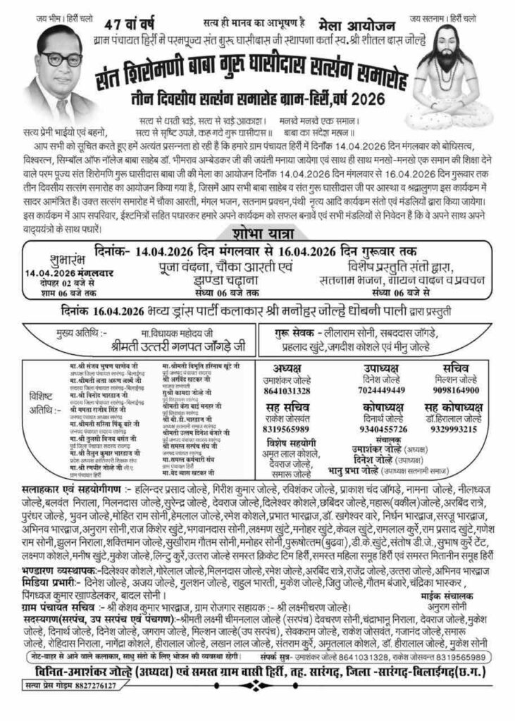 सारंगढ़-बिलाईगढ़। ग्राम पंचायत हिर्री में संत शिरोमणि बाबा गुरु घासीदास जी के 47वें वर्ष के अवसर पर तीन दिवसीय सत्संग समारोह एवं मेला आयोजन 14 अप्रैल से 16 अप्रैल 2026 तक भव्य रूप से किया जा रहा है। ग्राम पंचायत हिर्री में आयोजित इस धार्मिक एवं सांस्कृतिक कार्यक्रम को लेकर क्षेत्र में उत्साह का माहौल बना हुआ है।