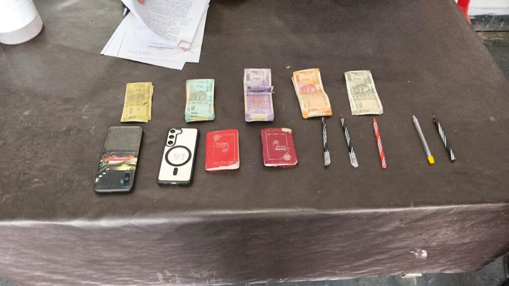 आरोपी के कब्जे से 02 नग मोबाईल मे विभिन्न अंको मे सट्टा पट्टी लिखा हुआ 09 पेज, 02 नग पेपर पेड, पेन व नगदी रकम 8240/रू एवं जुमला किमती 28240/रू को मुताबिक जप्ति पत्रक के जप्त कर कब्जा पुलिस लिया गया तथा आरोपी को विधिवत गिरफ्तार कर न्यायिक रिमाण्ड पर जेल भेजा गया एवं 01 आरोपी फरार है |