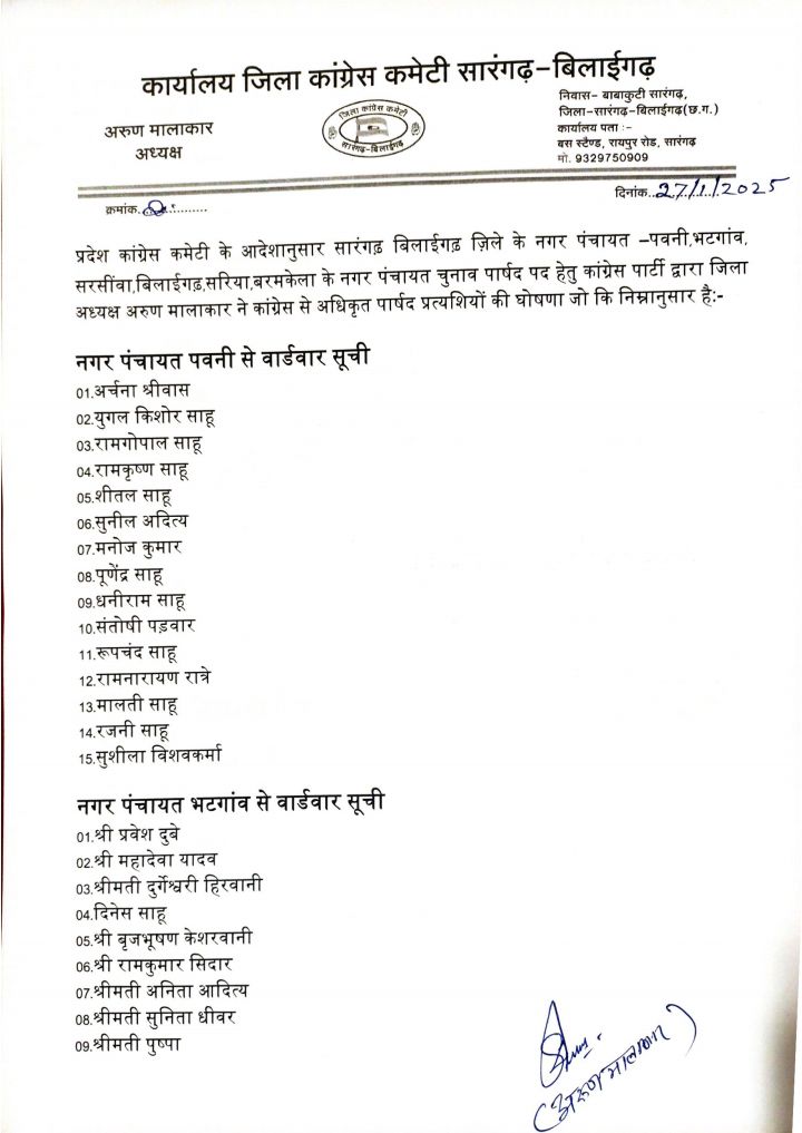 प्रदेश कांग्रेस कमेटी के आदेशानुसार सारंगढ़ बिलाईगढ़ ज़िले के नगर पंचायत -पवनी,भटगांव, सरसींवा,बिलाईगढ़,सरिया,बरमकेला के नगर पंचायत चुनाव पार्षद पद हेतु कांग्रेस पार्टी द्वारा जिला अध्यक्ष अरुण मालाकार ने कांग्रेस से अधिकृत पार्षद प्रत्यशियों की घोषणा जो कि निम्नानुसार है ।