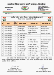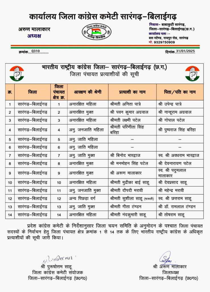 सारंगढ़ बिलाईगढ़ जिला कांग्रेस कमेटी ने जिले के 14 जिला पंचायत सदस्यों में से 12 जिला पंचायत सदस्यों की सूची जारी की है जिला पंचायत क्षेत्र क्रमांक 5 व 6 अभी बाकी है