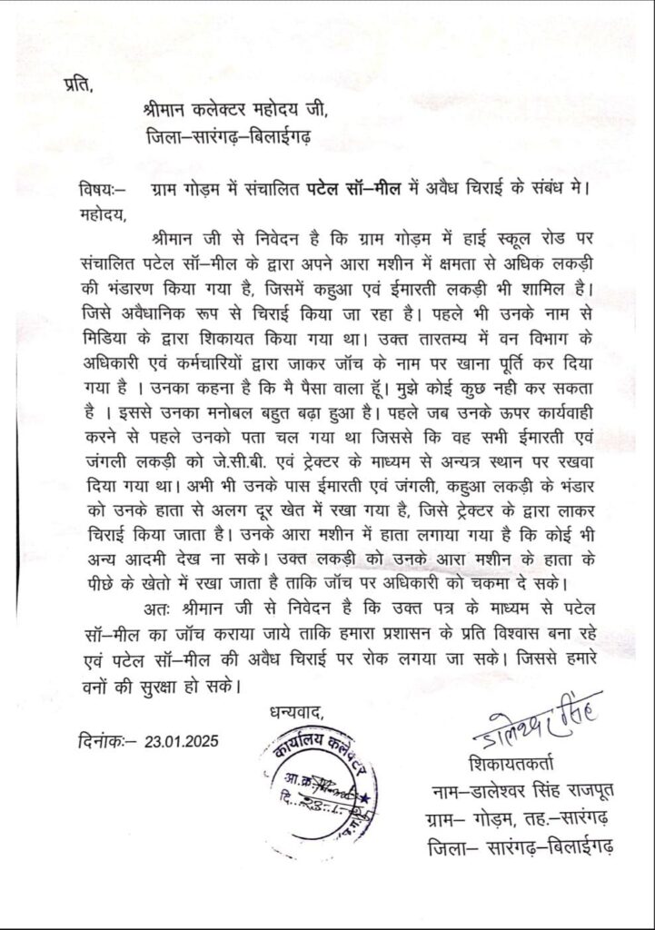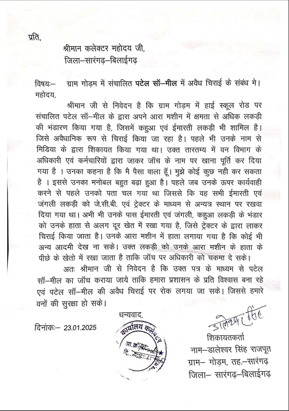 स्थानीय लोगों ने जिला कलेक्टर से शिकायत कर संबंधित आरामिल पर कार्यवाही की मांग की है, आईए पढ़ते है शिकायतकर्ता ने अपने शिकायत