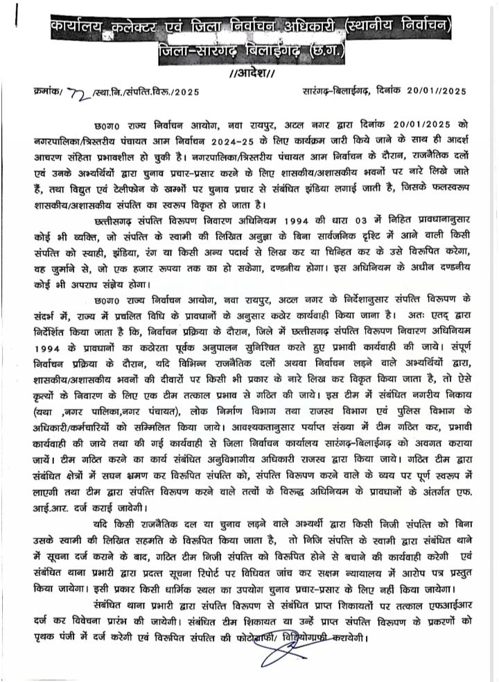 सारंगढ़ बिलाईगढ़, 5 फरवरी 2025/कलेक्टर धर्मेश कुमार ने आदेश जारी कर कहा है कि छत्तीसगढ़ सम्पत्ति विरूपण निवारण अधिनियम 1994 के प्रावधानों का कठोरतापूर्वक अनुपालन सुनिश्चित करते हुए प्रभावी कार्यवाही की जाये।कोई भी शासकीय कर्मी, किसी भी मकान और दुकान मालिक को संपत्ति विरूपण में सहमति है तो लिखित सहमति पत्र प्राप्त करेंगे। यदि किसी व्यक्ति द्वारा सहमति के लिए दबाव बनाया जाता है तो यह निर्वाचन नियमों का उल्लंघन है और उस व्यक्ति के विरुद्ध कार्यवाही किया जाएगा।